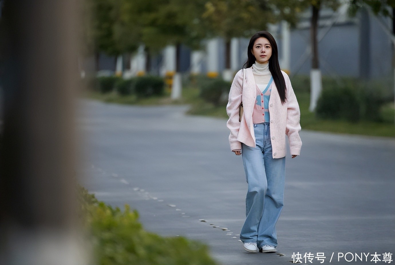 如果说长款毛呢大衣是温婉千金风,红色针织衫是温柔节日风,那这套粉色针织开衫叠搭造型,就是青春女大感的代表。赵今麦在剧中大胆尝试“粉色针织开衫+粉蓝格纹短款开衫”的叠穿方式,内搭白色高领打底,下半身搭配蓝色高腰牛仔裤,整体色调以粉、蓝、白为主,清新又甜美,完美契岁的年龄气质,把江浙沪甜妹的青春灵动展现得恰到好处。